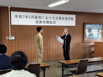 お知らせ 豪雨災害の復旧業務への感謝状をいただきました 2026年2月12日 熊本県宇城地域振興局様より、令和7年8月豪雨災害における復旧業務への感謝状を拝受いたしました。これからも地域の人々の日々の生活を守って参ります。
